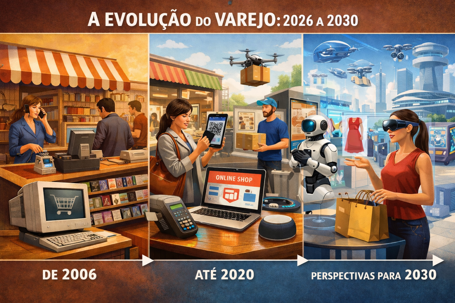 Evolução do varejo de 2006 até 2026 e perspectivas até 2030.
